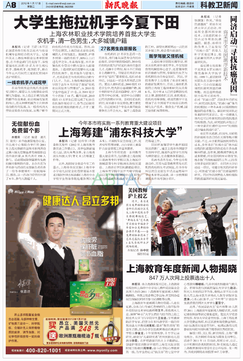 继学院“双主体”教学人才培养模式在新民晚报进行报道后,新民晚报再次对学院特色教学进行报道。1月17日,在新民晚报的A8版登载了题为大学生拖拉机手今夏下田,副标题是上海农林职业技术学院培养首批大学生农机手,清一色男生,大多城镇户籍的报道。