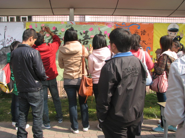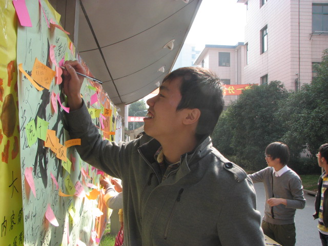 活动现场,同学们纷纷在留言板上签名,用最朴实的语句写下对祖国母亲的祝福。有同学表示:我国还处在发展中国家,更需要我们青年一代为之努力奋斗,希望祖国繁荣富强;也有同学在留言板上写道:钓鱼岛是中国的。短短的半个小时,宣传板上就密密麻麻写下了近百名学生的祝福和签名。