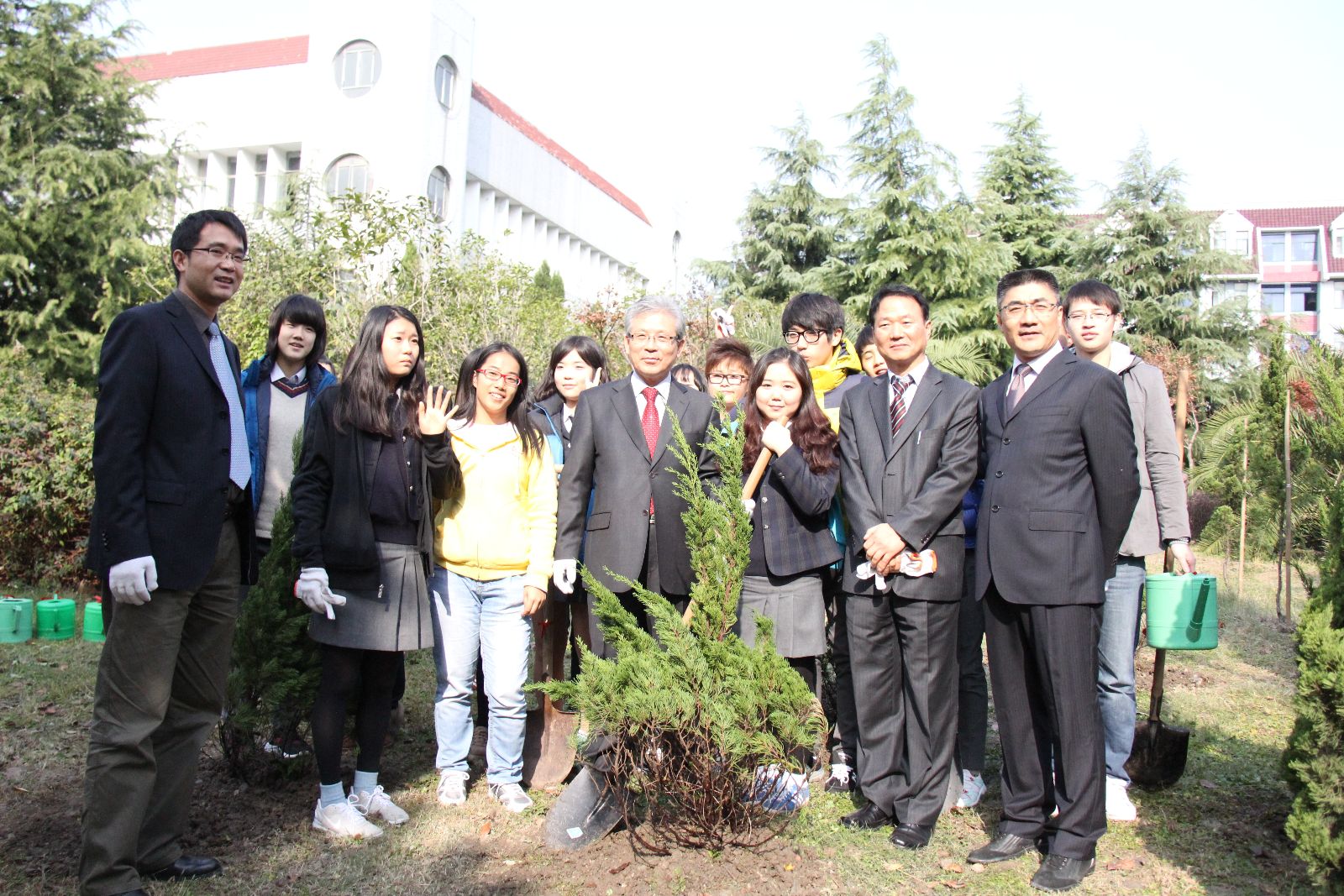 欢迎仪式结束后,韩方代表团师生参观了标本馆以及校园。两校师生代表来到学校体育馆东侧草坪上进行植树活动,在中韩友好纪念碑旁共同植下友谊之树。随后,韩方师生分组来到艺术插花教室和农家乐客房服务教学课堂进行观摩听课,与师生进行现场交流。