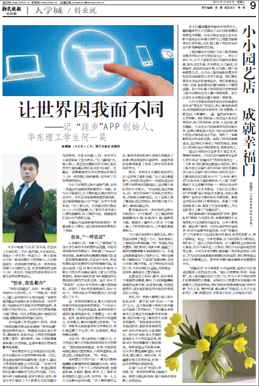 12月9日,新民晚报大学版刊登我校学生的创业故事。报道题目为:小小园艺店,成就幸福门。