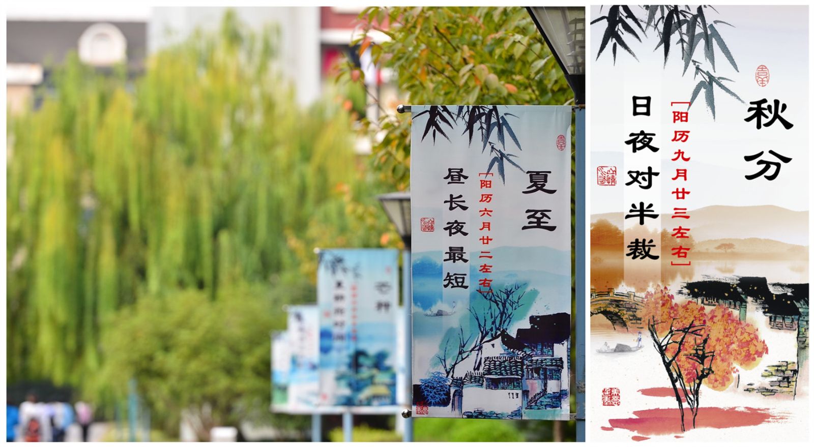 打造农林生态观光型校园,该学院植物种类达180余种,新增绿化空间1.1万平方米,校园绿化覆盖率达到39%。主干道两旁的农耕文化道旗十分引人注目,每面旗子主题各异,囊括了二十四节气、传统节日、农业谚语、五谷杂粮等主题,成为一道靓丽的风景线。据介绍,目前,该院已建成“上农梦”“上农魂”“上农韵”三大农业文化景观带。其中既有蕴含农耕文化之美的百农图和麦穗水晶灯,又有生命树等景观小品;既有静态的假山、巨石,又有四季更换的屋顶阳台绿化;广场砖铺设纵横相连,展现出古代“井田制”的土地制度特点。值得一提的是,“上农韵”农业文化景观带建设中引沈泾塘水系入校园,搭建近300余米长的钢结构亲水平台,可供师生观光休闲,周边分散种植四颗具有现代农业气息的“阳光树”,还布置了传统农业水车、竹林、花坛等景观。