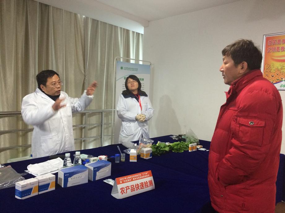 上海农林职业技术学院摆起长桌子,布置上新鲜的小白菜、几瓶牛奶以及密封包装的腌制品。这些常见食品都是为了示范如何做“农产品快速检测”。“不论从事生产还是消费,食品安全很重要。老百姓都很关心菜当中是否有农药,腌制食品中有没有亚硝酸盐,奶制品中有没有三聚氰胺,但他们没有好的设备进行检测。”农业生物系教师张江拆开速测试剂盒,详细讲解化学反应原理,告诉听众只要利用这些在市面上容易买到的检测剂,5-15分钟内,就能初步检测食品安全。不少青浦居民听了,赶忙记下速测卡名称,回去“学以致用”。现场也展示了节能增效农业物联网应用模式,希望让更多老百姓了解未来农业的发展方向。
