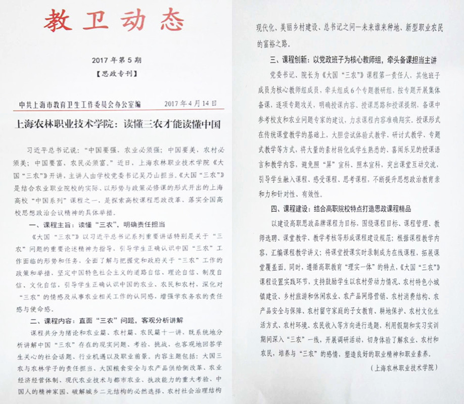 4月中旬,教卫动态2017年第5期思政专刊,刊登了我院“中国系列”课程《大国三农》。