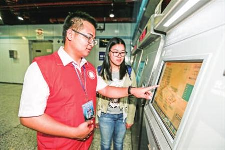 图为志愿者范超杰(左)正在9号线体育中心站内为乘客代买车票。