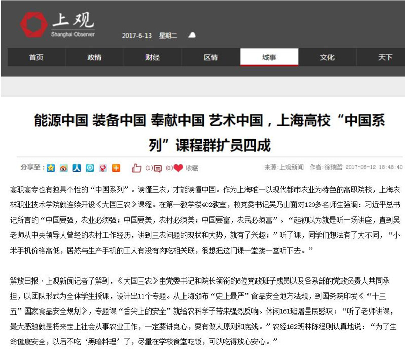 6月12日,上观报道:高职高专也有独具个性的“中国系列”。读懂三农,才能读懂中国。作为上海唯一以现代都市农业为特色的高职院校,上海农林职业技术学院就连续开设《大国三农》课程。