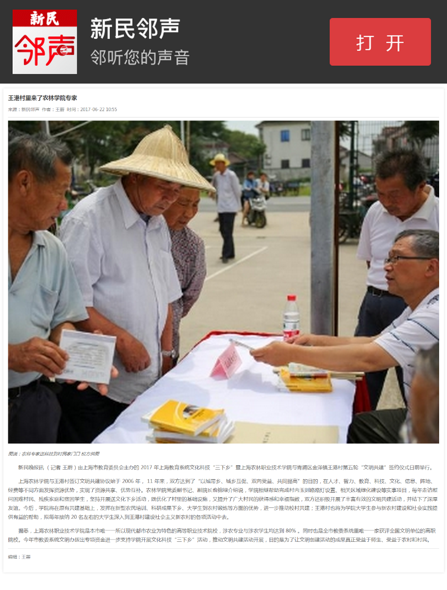 6月22日,新民邻声报道了我院在市教委系统文明办的支持下,开展2017年上海教育系统文化科技“三下乡”活动暨与青浦区金泽镇王港村第五轮“文明共建”签约仪式,让文明创建活动的成果真正受益于师生、受益于农村和村民。