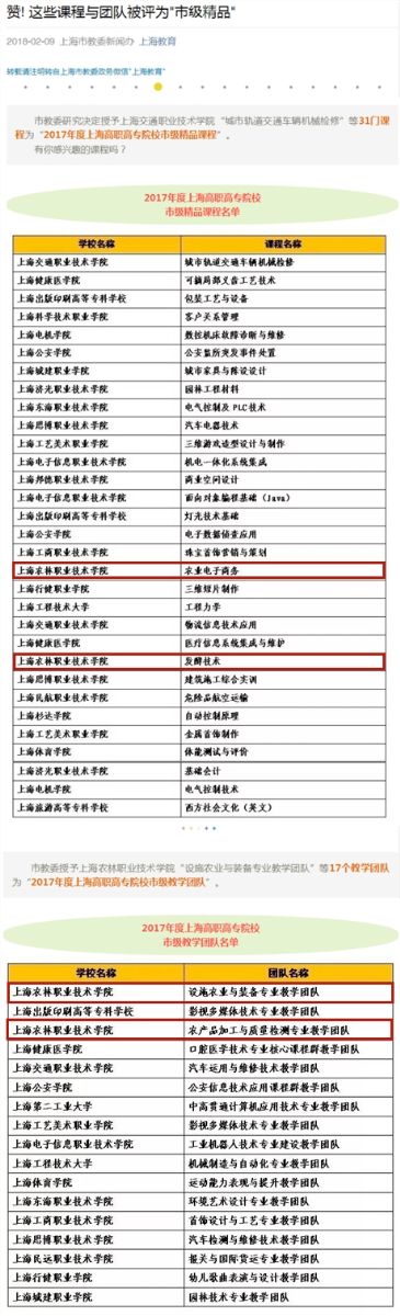 上海教育报道我院农业经济管理系杨冬梅老师主持《农业电子商务》和农业生物与生态技术系代书玲老师主持的《发酵技术》被评为市级精品课程;设施农业与装备专业教学团队和农产品加工与质量检测专业教学团队被评为市级教学团队。全文如下: