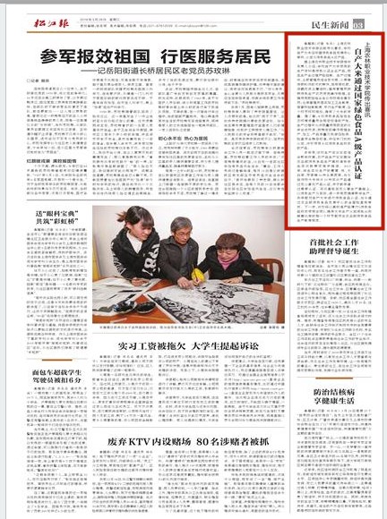 3月28日,松江报第三版报道我院自产大米通过国家绿色食品A级产品认证。