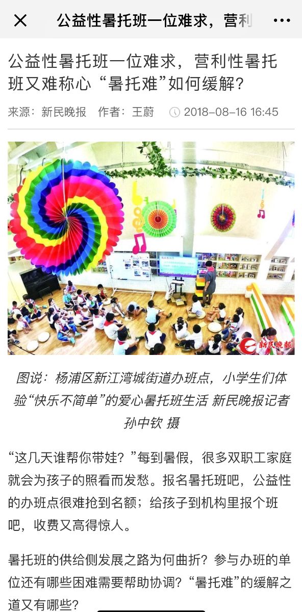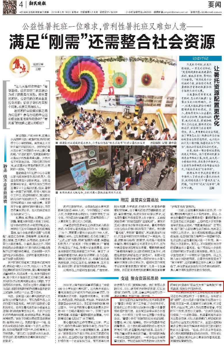8月16日,新民晚报第4版和微信客户端同时报道学院“警营小铃铛”爱心暑托班。