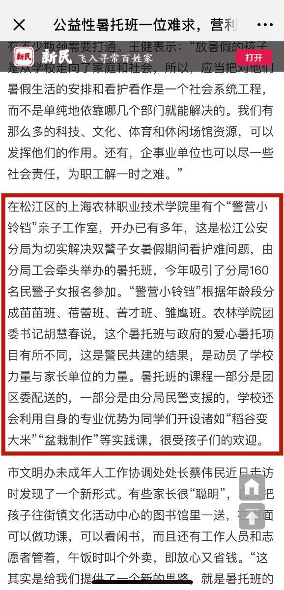 在松江区的上海农林职业技术学院里有个“警营小铃铛”亲子工作室,开办已有多年,这是松江公安分局为切实解决双警子女暑假期间看护难问题,由分局工会牵头举办的暑托班,今年吸引了分局160名民警子女报名参加。“警营小铃铛”根据年龄段分成苗苗班、蓓蕾班、菁才班、雏鹰班。农林学院团委书记胡慧春说,这个暑托班与政府的爱心暑托项目有所不同,这是警民共建的结果,是动员了学校力量与家长单位的力量。暑托班的课程一部分是团区委配送的,一部分是由分局民警支援的,学校还会利用自身的专业优势为同学们开设诸如“稻谷变大米”“盆栽制作”等实践课,很受孩子们的欢迎。