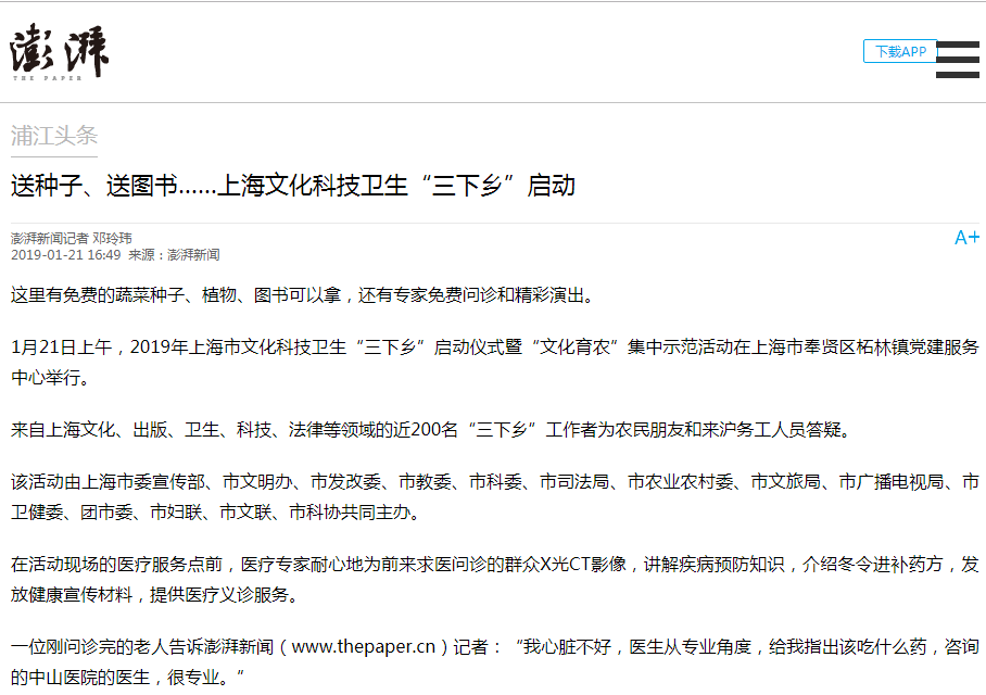 1月21日,澎湃新闻官方微信报道我院参加2019年上海市科技文化卫生“三下乡”活动启动仪式,并提供相应服务。
