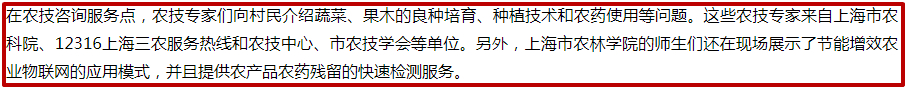 在农技咨询服务点,农技专家们向村民介绍蔬菜、果木的良种培育、种植技术和农药使用等问题。这些农技专家来自上海市农科院、12316上海三农服务热线和农技中心、市农技学会等单位。另外,上海市农林学院的师生们还在现场展示了节能增效农业物联网的应用模式,并且提供农产品农药残留的快速检测服务。