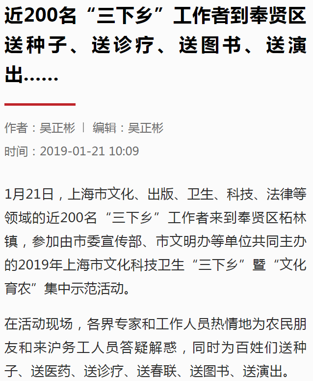 近200名“三下乡”工作者到奉贤区送种子、送诊疗、送图书、送演出……