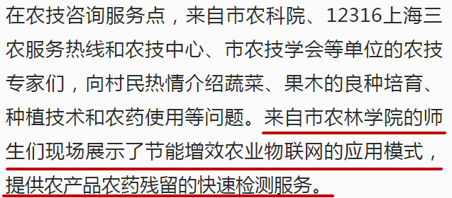 在农技咨询服务点,来自市农科院、12316上海三农服务热线和农技中心、市农技学会等单位的农技专家们,向村民热情介绍蔬菜、果木的良种培育、种植技术和农药使用等问题。来自市农林学院的师生们现场展示了节能增效农业物联网的应用模式,提供农产品农药残留的快速检测服务。