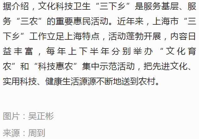 据介绍,文化科技卫生“三下乡”是服务基层、服务“三农”的重要惠民活动。近年来,上海市“三下乡”工作立足上海特点,活动蓬勃开展,内容日益丰富,每年上下半年分别举办“文化育农”和“科技惠农”集中示范活动,把先进文化、实用科技、健康生活源源不断地送到农村。