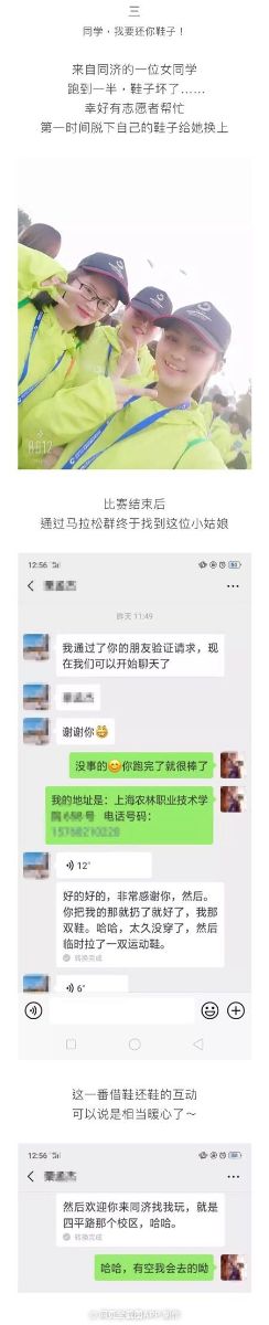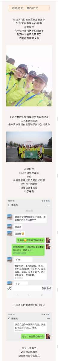 在这次马拉松比赛志愿服务中,发生了许多暖心的趣事,在赛程中有一位来自同济学校的选手跑到一半发现鞋子坏了又特别想跑完全程,上海农林职业技术学院的青年志愿者在了解到情况后毫不犹豫地把自己的鞋子脱下为其助力,小姑娘说自己当时也没在意,事后参赛选手通过万人马拉松的群找到自己的老师,辗转找到小姑娘以示感谢,并邀请小姑娘到她的学校来玩,因为一双鞋子,让这次志愿服务变得更有青春的意义。