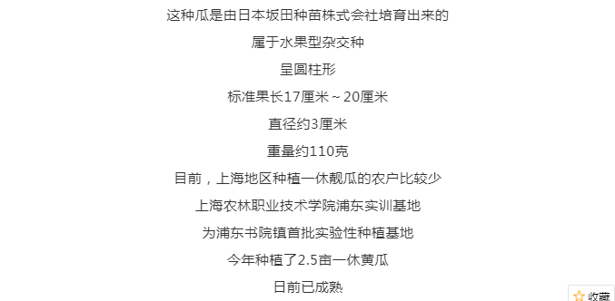 这种瓜是由日本坂田种苗株式会社培育出来的新型黄瓜,属于水果型杂交种,呈圆柱形。标准果长17厘米~20厘米,直径约3厘米,重量约110克。目前,上海地区种植一休靓瓜的农户比较少。上海农林职业技术学院浦东实训基地为浦东书院镇首批实验性种植基地,今年种植了2.5亩一休靓瓜,日前已成熟上市。