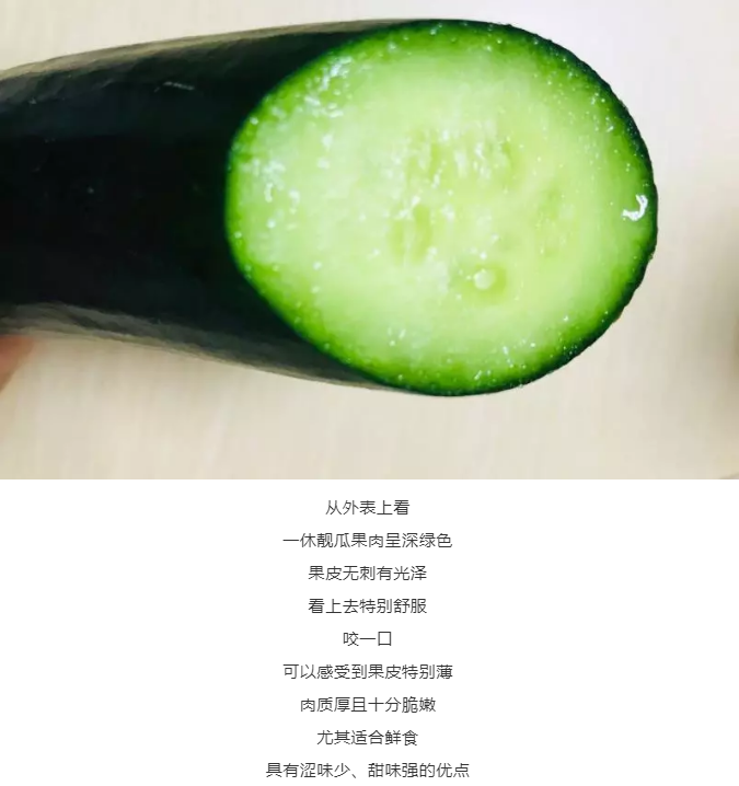 从外表上看,一休靓瓜果肉呈深绿色,果皮无刺有光泽,看上去特别舒服。咬一口,可以感受到果皮特别薄,肉质特别厚且十分脆嫩,尤其适合鲜食,具有涩味少、甜味强的优点。相比市场上其他“水果黄瓜”,一休靓瓜属于佼佼者。很多来此尝过鲜的市民向记者表示,吃了这个“黑黄瓜”后,就再也不想吃别的“水果黄瓜”了。