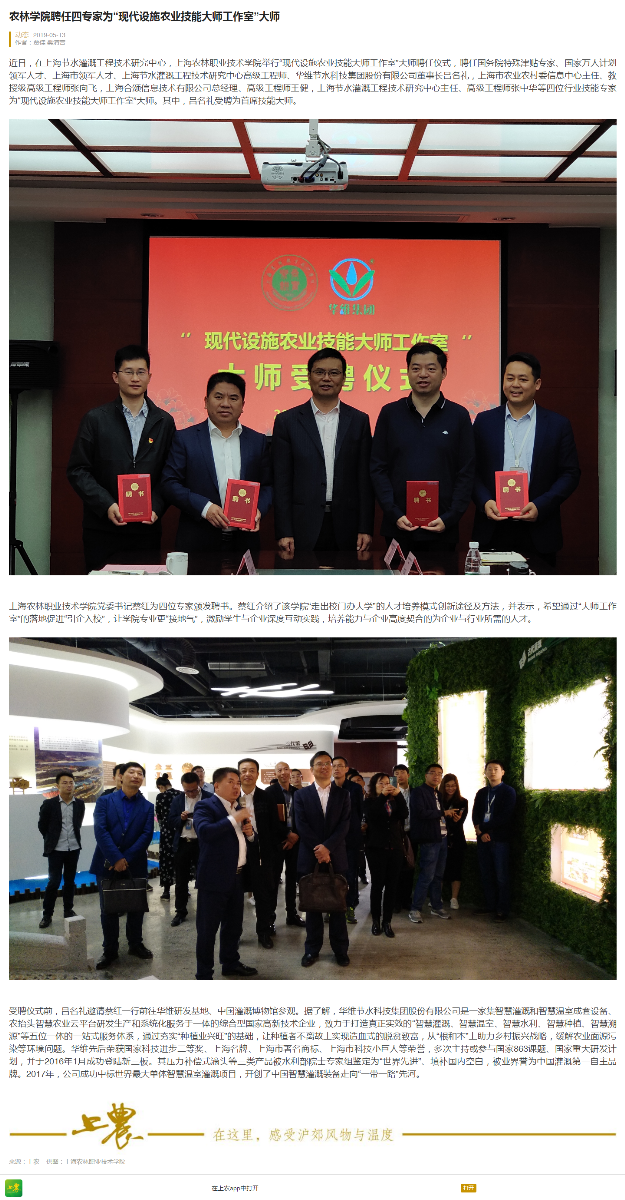 ?近日,在上海节水灌溉工程技术研究中心,上海农林职业技术学院举行“现代设施农业技能大师工作室”大师聘任仪式,聘任国务院特殊津贴专家、国家万人计划领军人才、上海市领军人才、上海节水灌溉工程技术研究中心高级工程师、华维节水科技集团股份有限公司董事长吕名礼,上海市农业农村委信息中心主任、教授级高级工程师张向飞,上海合颂信息技术有限公司总经理、高级工程师王健,上海节水灌溉工程技术研究中心主任、高级工程师张中华等四位行业技能专家为“现代设施农业技能大师工作室”大师。其中,吕名礼受聘为首席技能大师。