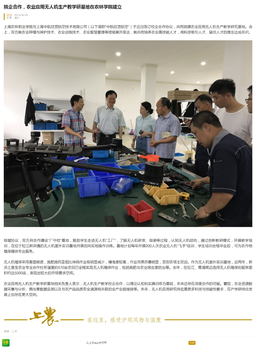 6月28日,上农新闻客户端报道我院开展院企合作,建立农业应用无人机生产教学研基地。