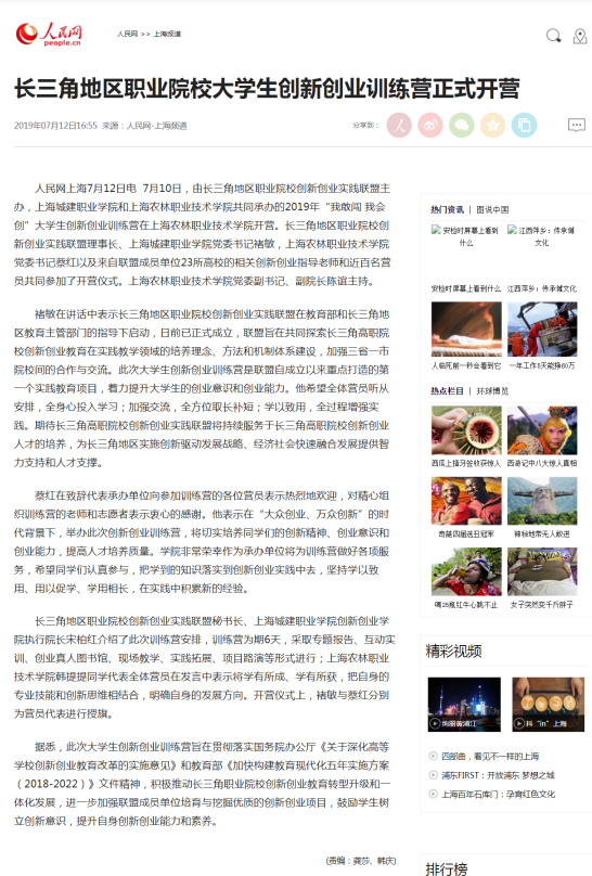 7月12日,人民网报道学院承办的长三角地区职业院校大学生创新创业训练营正式开营。