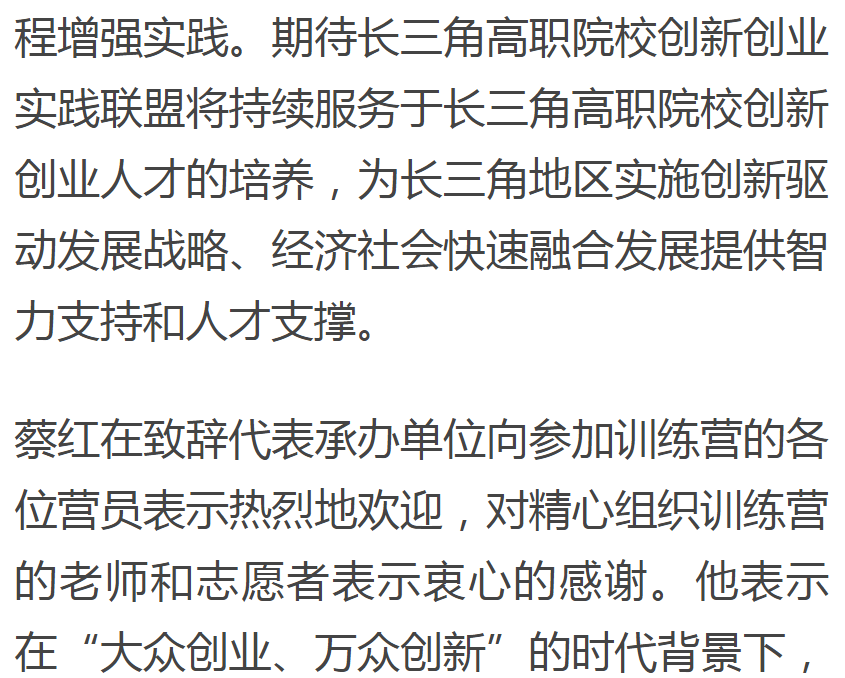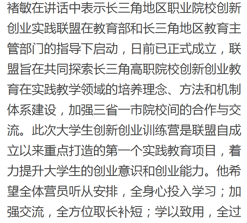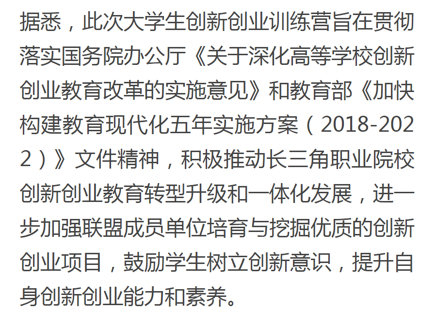 据悉,此次大学生创新创业训练营旨在贯彻落实国务院办公厅《关于深化高等学校创新创业教育改革的实施意见》和教育部《加快构建教育现代化五年实施方案(2018-2022)》文件精神,积极推动长三角职业院校创新创业教育转型升级和一体化发展,进一步加强联盟成员单位培育与挖掘优质的创新创业项目,鼓励学生树立创新意识,提升自身创新创业能力和素养。