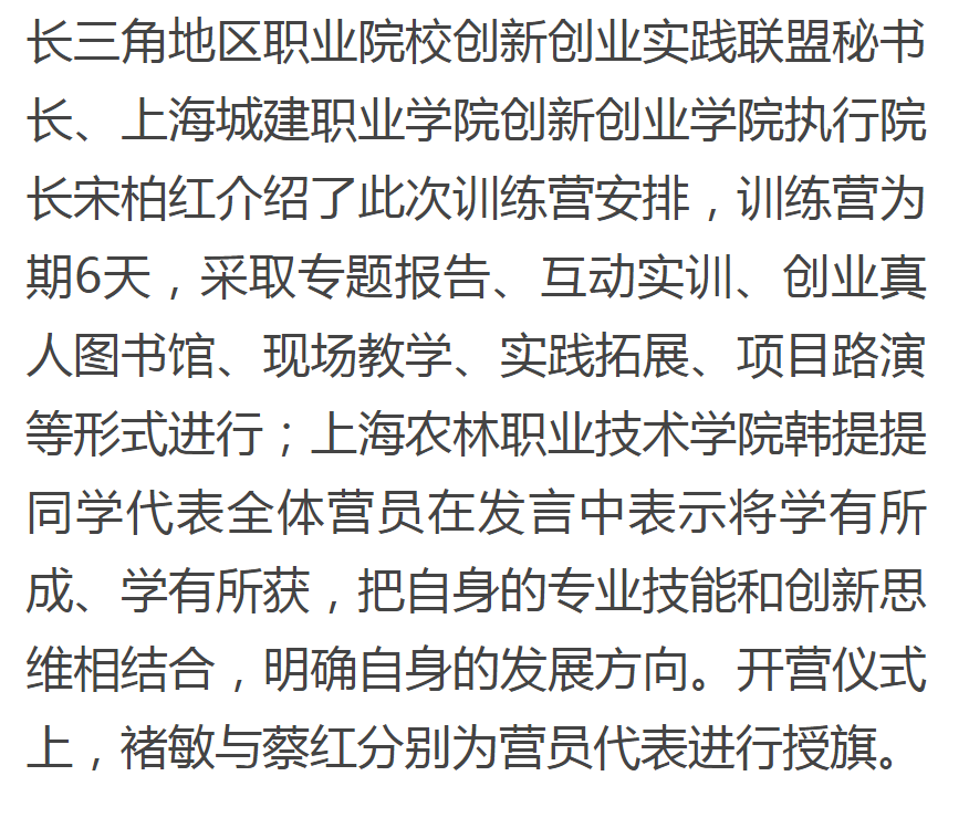 长三角地区职业院校创新创业实践联盟秘书长、上海城建职业学院创新创业学院执行院长宋柏红介绍了此次训练营安排,训练营为期6天,采取专题报告、互动实训、创业真人图书馆、现场教学、实践拓展、项目路演等形式进行;上海农林职业技术学院韩提提同学代表全体营员在发言中表示将学有所成、学有所获,把自身的专业技能和创新思维相结合,明确自身的发展方向。开营仪式上,褚敏与蔡红分别为营员代表进行授旗。