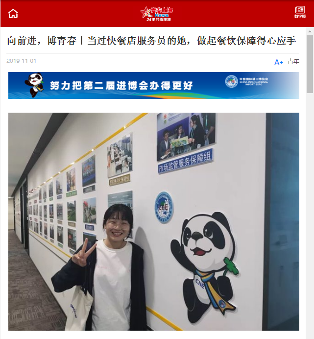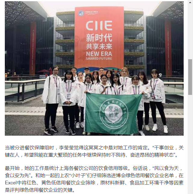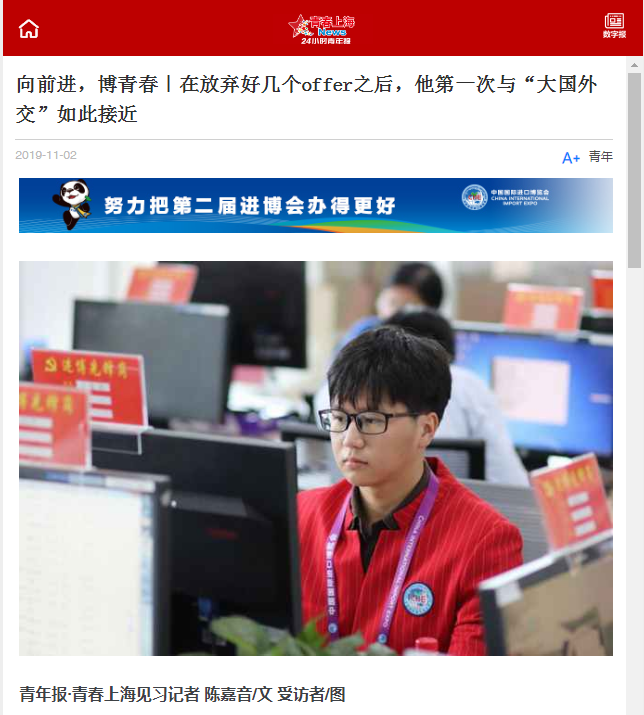 11月1日和2日,青年报连续两天报道学院 “小叶子”服务第二届进博会。