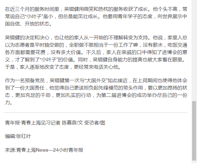 吴锟健的决定和决心,也让他的家人从一开始的不理解转变为支持。他说,家里人总以为志愿者是平时抽空做的,全职做不就相当于一份工作了嘛,没有薪水,吃饭交通各方面都需要花费,没有多大价值。不久后,家人在亲戚的口中得知了进博会的意义,才了解到了“小叶子”的价值。同时,吴锟健自身能力的提高也被大家看在眼里。于是,家人逐渐地改变了态度,更经常来电话关心他。