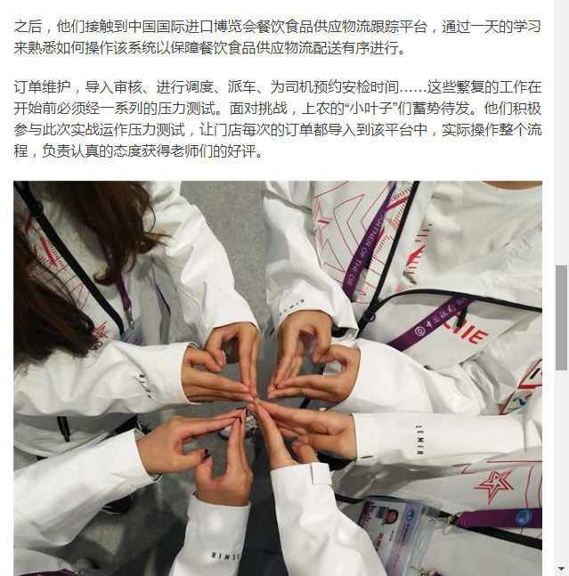 之后,他们接触到中国国际进口博览会餐饮食品供应物流跟踪平台,通过一天的学习来熟悉如何操作该系统以保障餐饮食品供应物流配送有序进行。