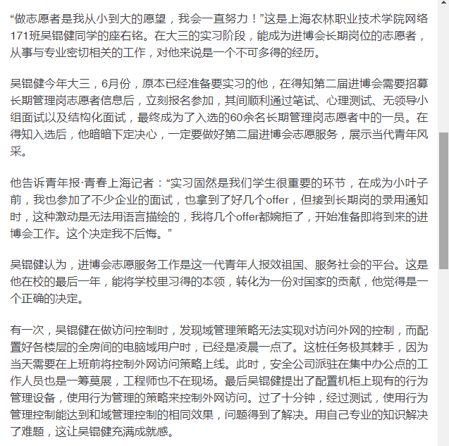 “做志愿者是我从小到大的愿望,我会一直努力!”这是上海农林职业技术学院网络171班吴锟健同学的座右铭。在大三的实习阶段,能成为进博会长期岗位的志愿者,从事与专业密切相关的工作,对他来说是一个不可多得的经历。