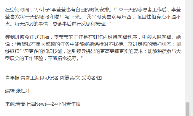 他告诉青年报·青春上海记者:“实习固然是我们学生很重要的环节,在成为小叶子前,我也参加了不少企业的面试,也拿到了好几个offer,但接到长期岗的录用通知时,这种激动是无法用语言描绘的,我将几个offer都婉拒了,开始准备即将到来的进博会工作。这个决定我不后悔。”