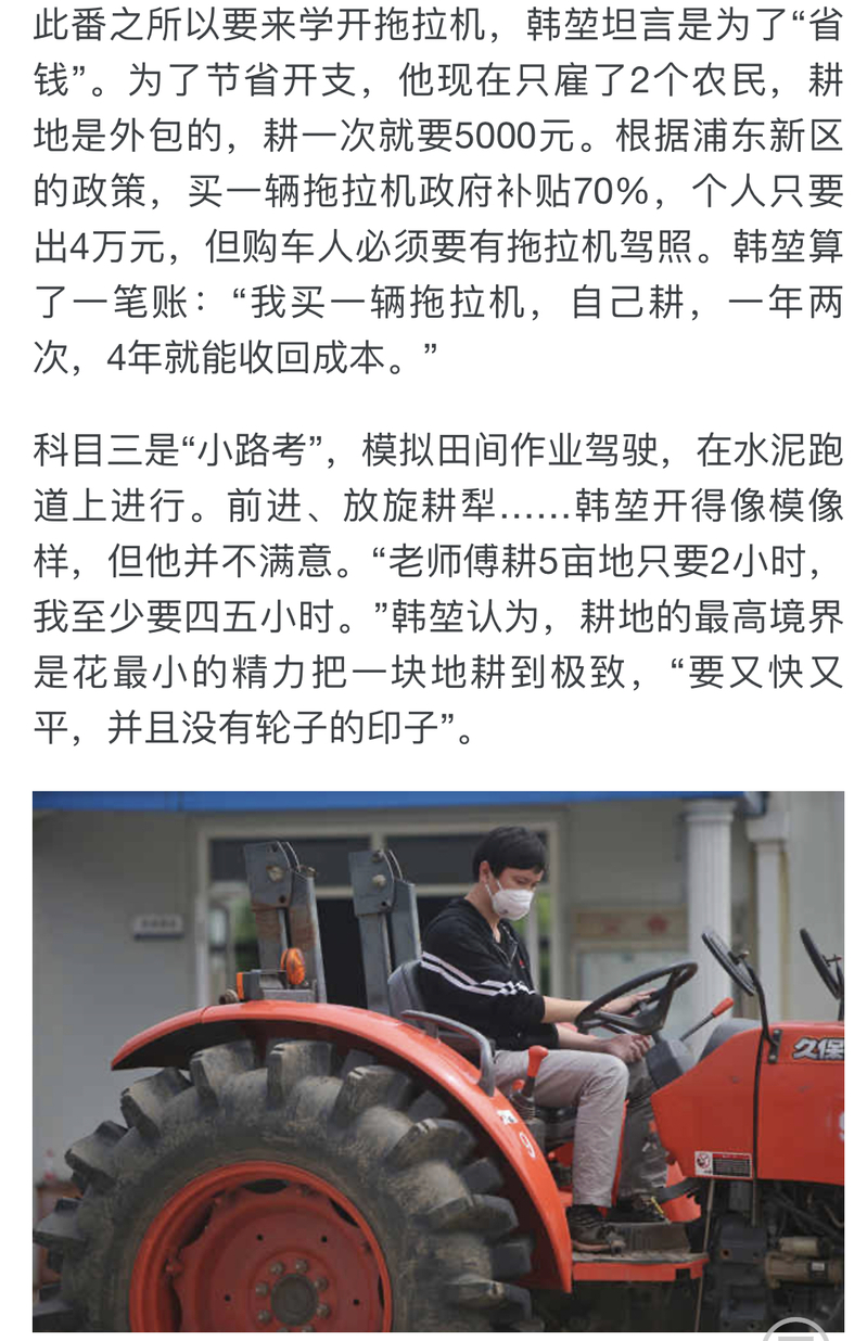 此番之所以要来学开拖拉机,韩堃坦言是为了“省钱”。为了节省开支,他现在只雇了2个农民,耕地是外包的,耕一次就要5000元。根据浦东新区的政策,买一辆拖拉机政府补贴70%,个人只要出4万元,但购车人必须要有拖拉机驾照。韩堃算了一笔账:“我买一辆拖拉机,自己耕,一年两次,4年就能收回成本。”