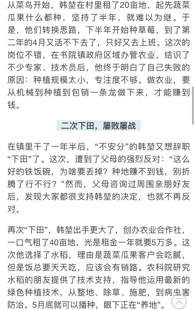 在镇里干了一年半后,“不安分”的韩堃又想辞职“下田”了。这次,遭到了父母的强烈反对:“这么好的铁饭碗,为啥要丢掉?种地赚不到钱,别折腾了行不行?”然而,父母咨询过周围亲朋好友后,发现大家都很支持韩堃的决定,也就不再反对。