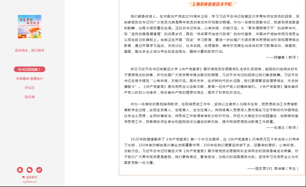 习近平总书记近日给复旦大学《共产党宣言》展示馆党员志愿服务队全体队员回信,引发师生热议。7月1日,我院师生代表学习《回信》的感悟和体会被刊登在易班网“坚定信念 践行使命”主题活动展示板块。全文如下: