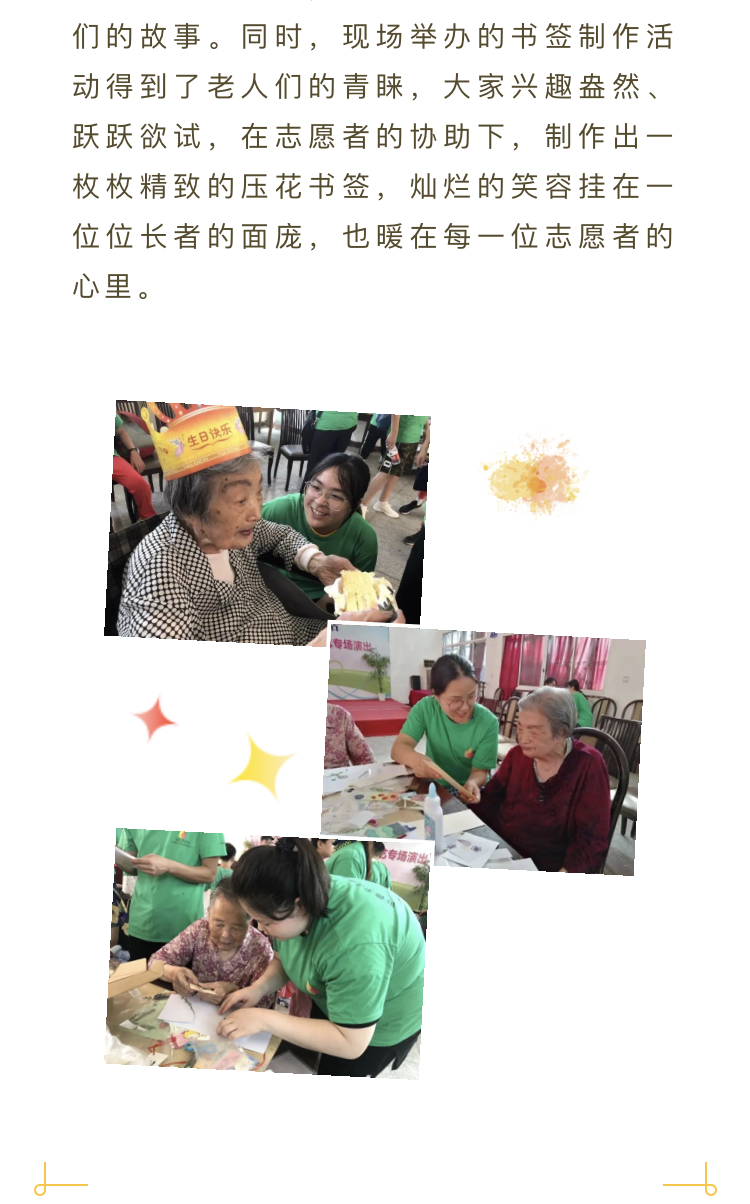 夏日炎炎,上海青年志愿者们热情不减,一场场温馨的为老志愿服务活动持续开展,8月上旬,上海农林职业技术学院园林系7名师生志愿者前往浦东新区汇亲园养护院,开展青年为老志愿服务。志愿者为长者们精心准备了一个温暖的集体生日会,志愿者们为寿星们送上生日蛋糕、唱起生日歌,全场长者们一个个都乐开了花。生日会后,志愿者们还为活动不便的老人剪指甲,陪老人们聊天、倾听他们的故事。同时,现场举办的书签制作活动得到了老人们的青睐,大家兴趣盎然、跃跃欲试,在志愿者的协助下,制作出一枚枚精致的压花书签,灿烂的笑容挂在一位位长者的面庞,也暖在每一位志愿者的心里。