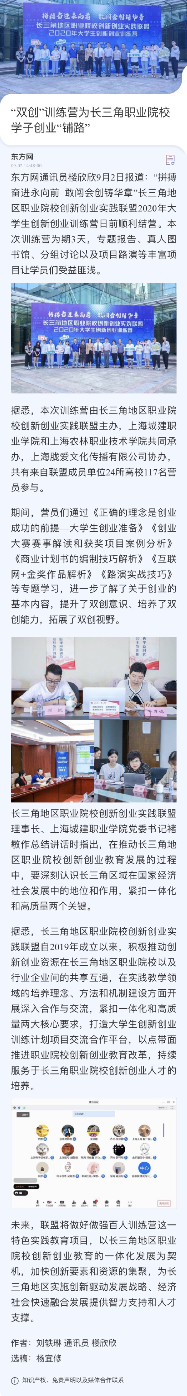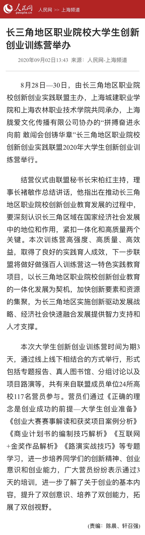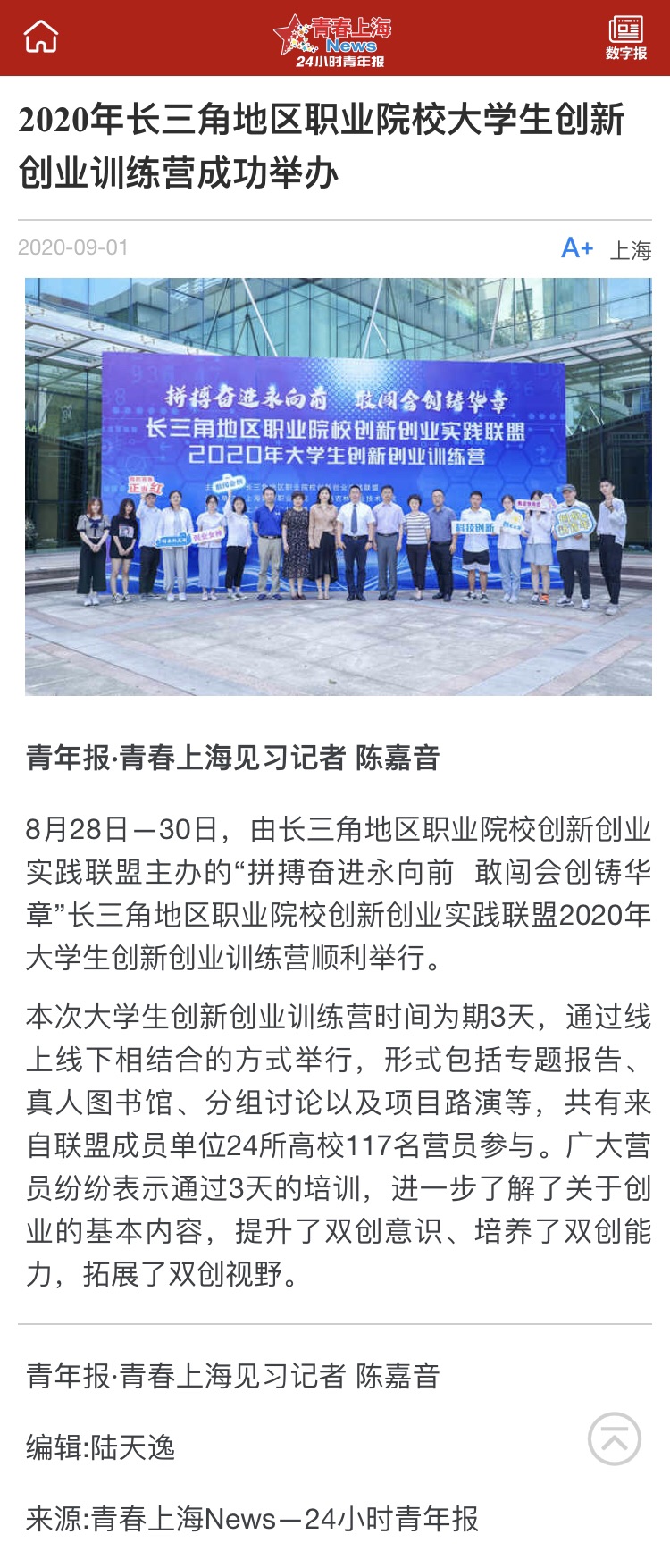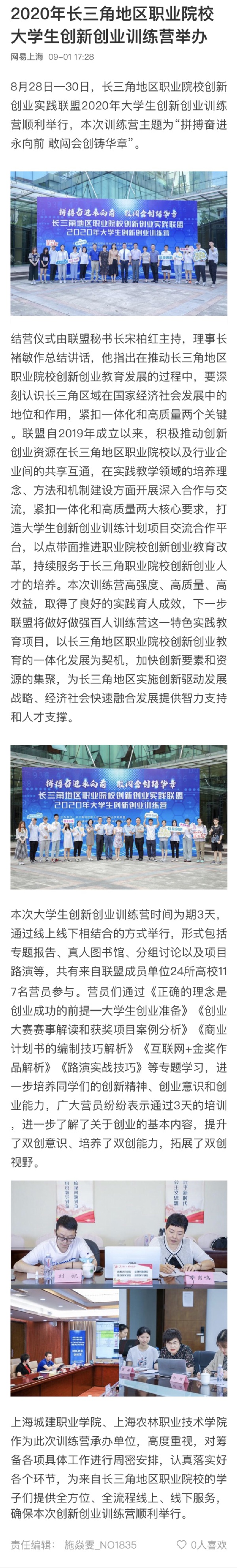 近日,人民网、东方新闻、青年报、网易新闻分别报道我院承办2020年长三角地区职业院校大学生创新创业训练营。