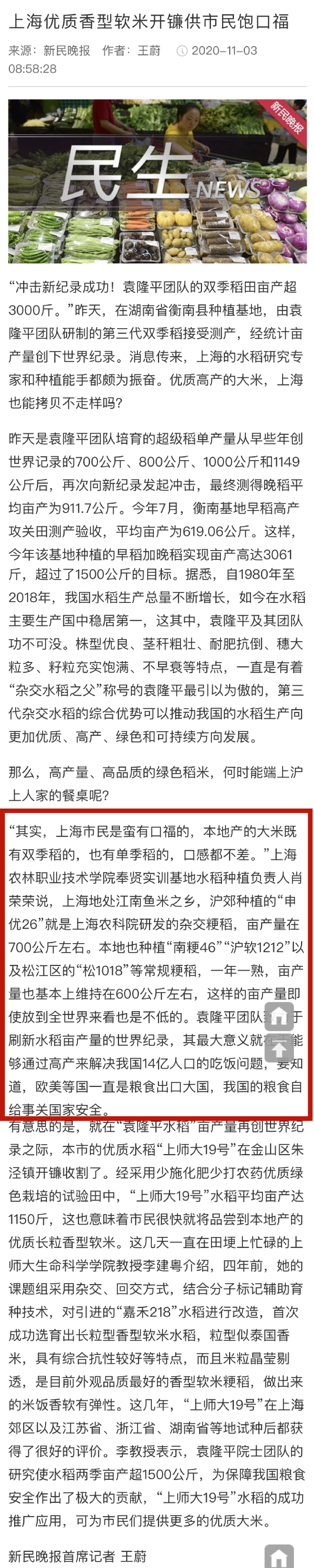 11月3日,新民晚报采访报道了我院实训基地水稻种植负责人肖荣荣,全文如下: