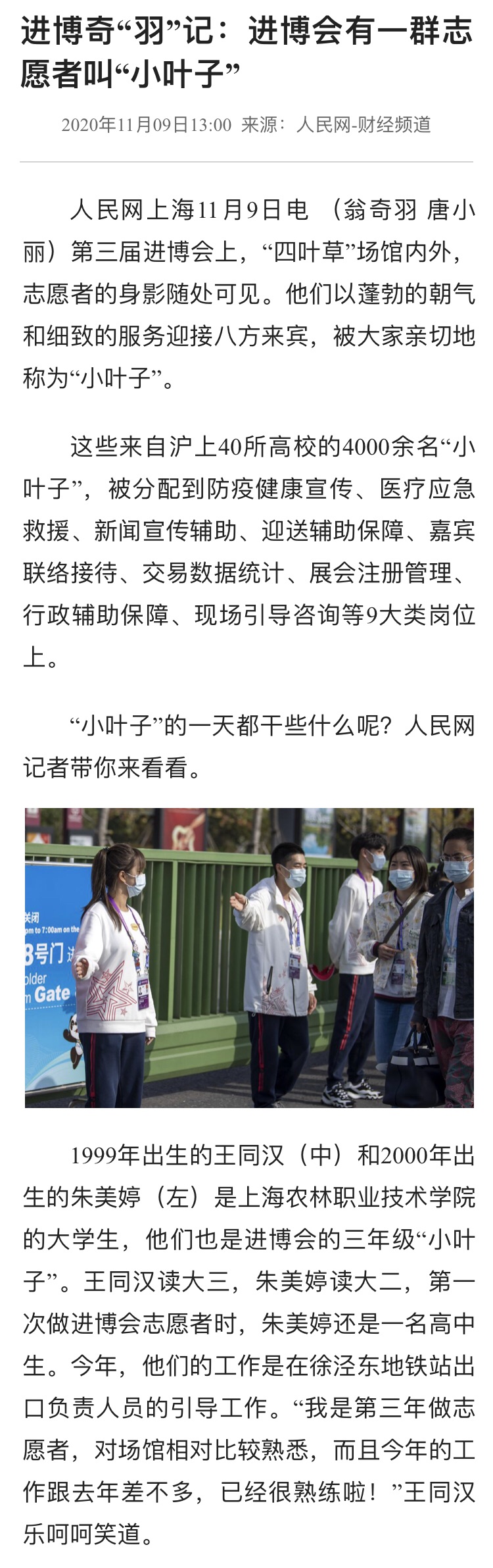 进博奇“羽”记:进博会有一群志愿者叫“小叶子”。人民网上海11月9日电 (翁奇羽 唐小丽)第三届进博会上,“四叶草”场馆内外,志愿者的身影随处可见。他们以蓬勃的朝气和细致的服务迎接八方来宾,被大家亲切地称为“小叶子”。