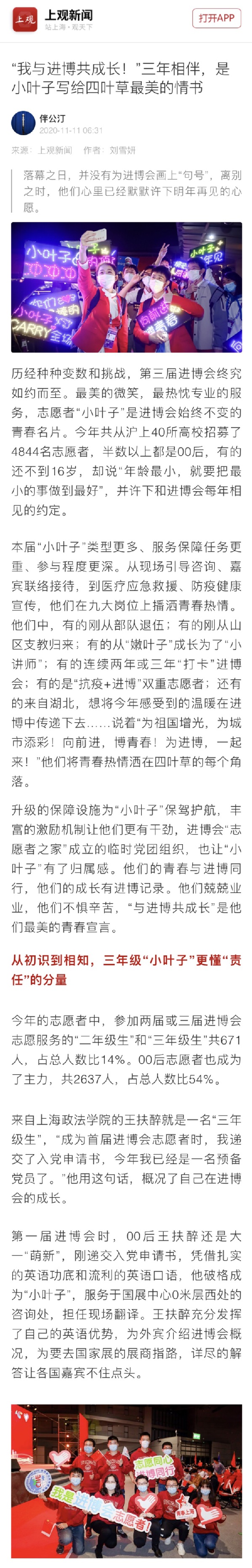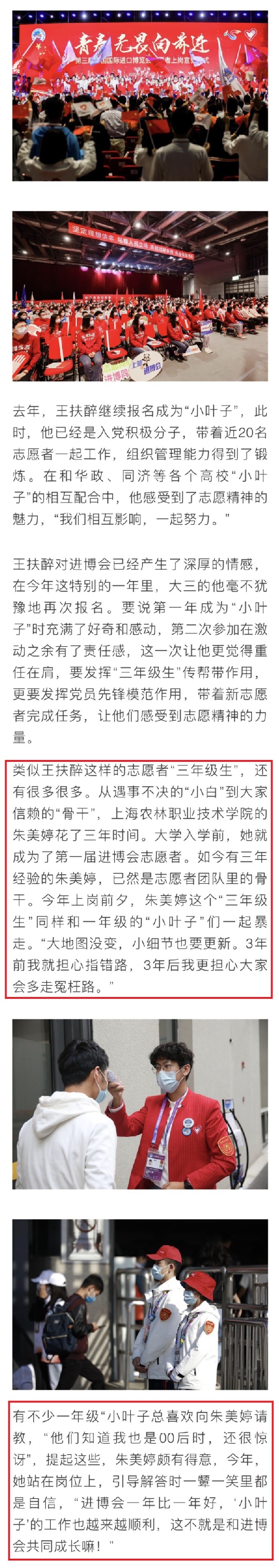 升级的保障设施为“小叶子”保驾护航,丰富的激励机制让他们更有干劲,进博会“志愿者之家”成立的临时党团组织,也让“小叶子”有了归属感。他们的青春与进博同行,他们的成长有进博记录。他们兢兢业业,他们不惧辛苦,“与进博共成长”是他们最美的青春宣言。