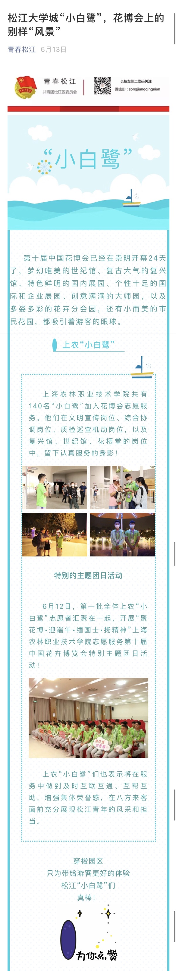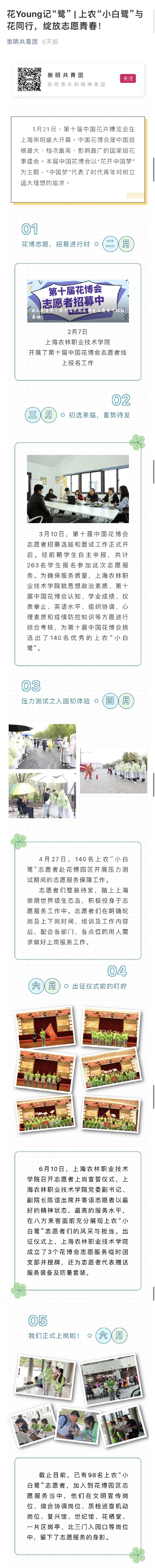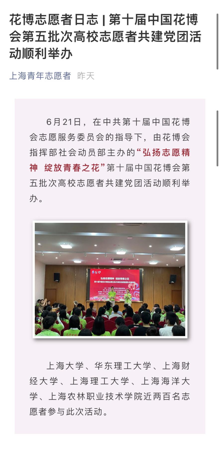 近日,上海青年志愿者、崇明共青团、青春松江微信公众号分别报道我院参与第十届中国花卉博览会志愿服务工作。全文如下:
