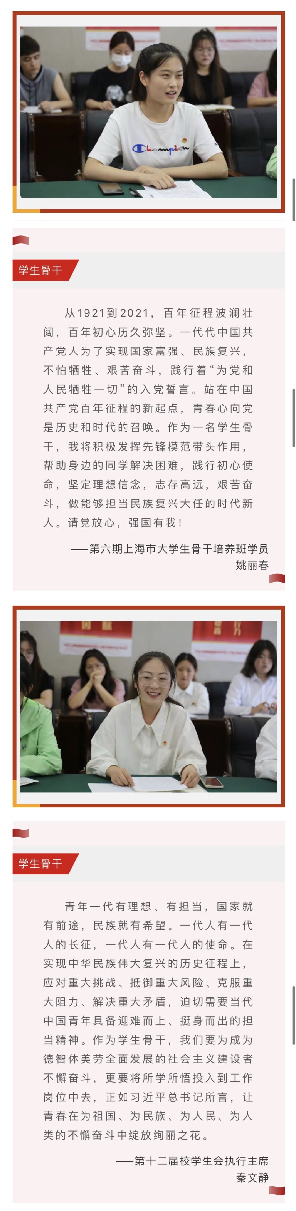 从1921到2021,百年征程波澜壮阔,百年初心历久弥坚。一代代中国共产党人为了实现国家富强、民族复兴,不怕牺牲、艰苦奋斗,践行着“为党和人民牺牲一切”的入党誓言。站在中国共产党百年征程的新起点,青春心向党是历史和时代的召唤。作为一名学生骨干,我将积极发挥先锋模范带头作用,帮助身边的同学解决困难,践行初心使命,坚定理想信念,志存高远,艰苦奋斗,做能够担当民族复兴大任的时代新人。请党放心,强国有我!