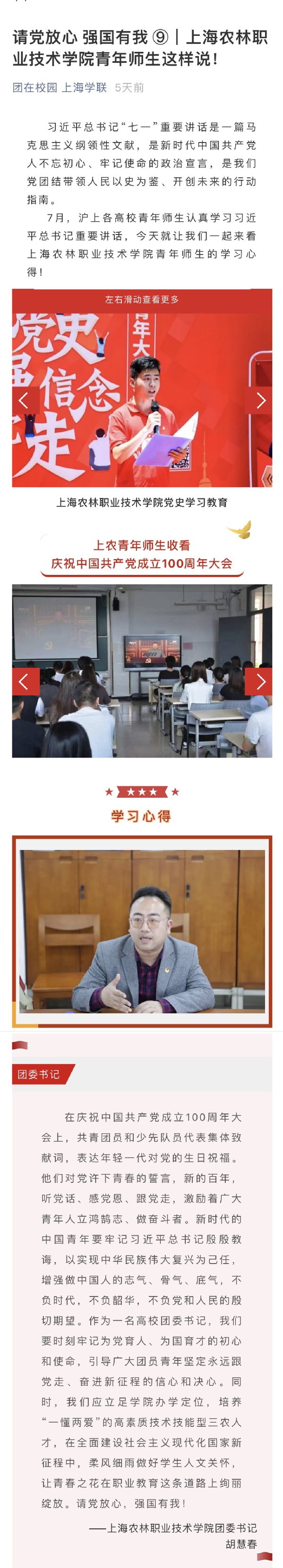 7月,沪上各高校青年师生认真学习习近平总书记重要讲话,今天就让我们一起来看上海农林职业技术学院青年师生的学习心得!