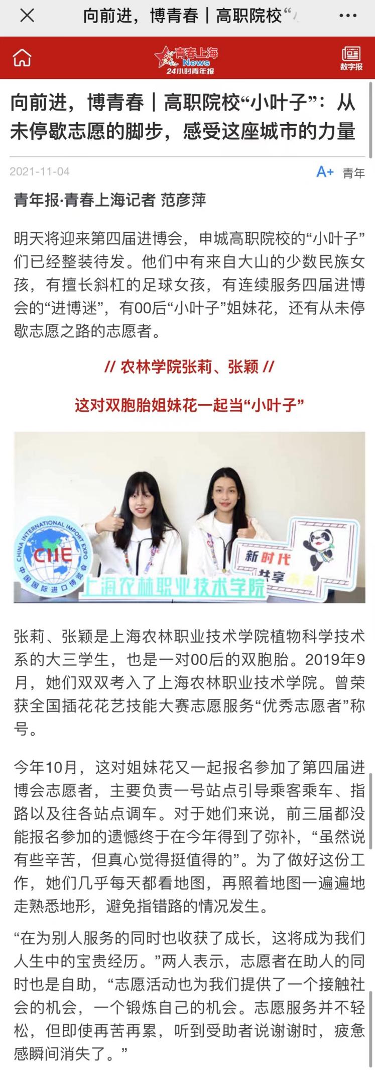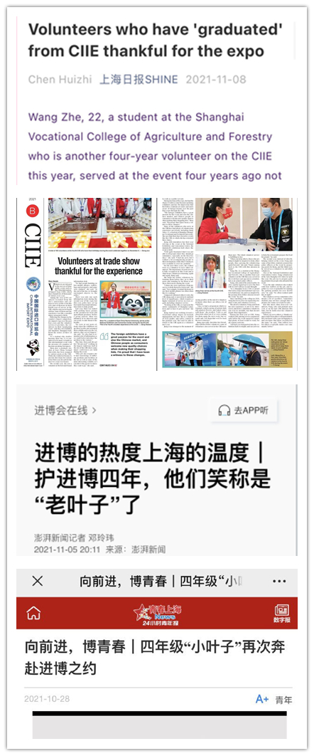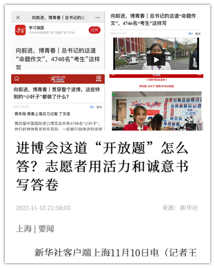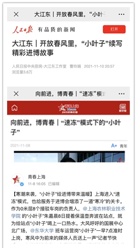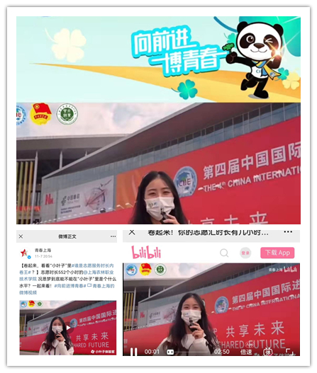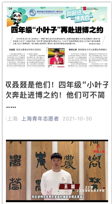 在志愿服务第四届中国国际进口博览会的过程中,学院116名上农“小叶子”也成为众多媒体镜头中的C位,他们,优秀事迹也受到了新华社、人民日报、学习强国、上海日报、澎湃新闻、青年报、青春上海、上海青年志愿者、青春松江等数10家媒体平台32次报道宣传,让我们一起来看看上农“小叶子”的故事吧!