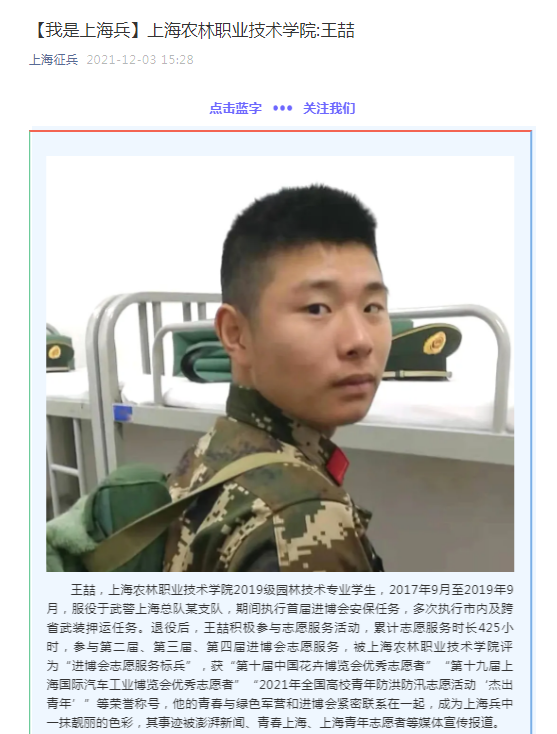 12月3日,“上海征兵”微信公众号报道大学生士兵王喆志愿服务进博会事迹。报道原文如下: