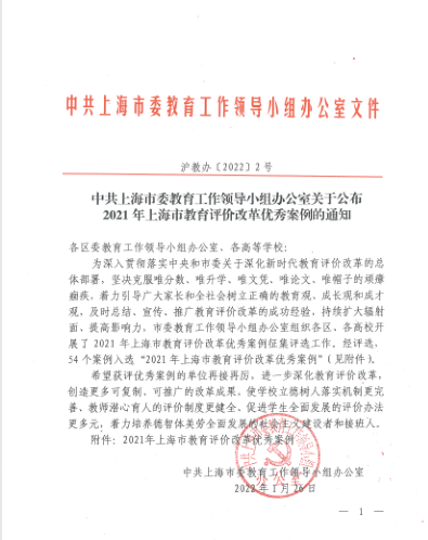 近日,从中共上海市委教育工作领导小组办公室获悉,学校报送的《以评价改革突破教师引进培育瓶颈》案例,被评为2021年上海市教育评价改革优秀案例。