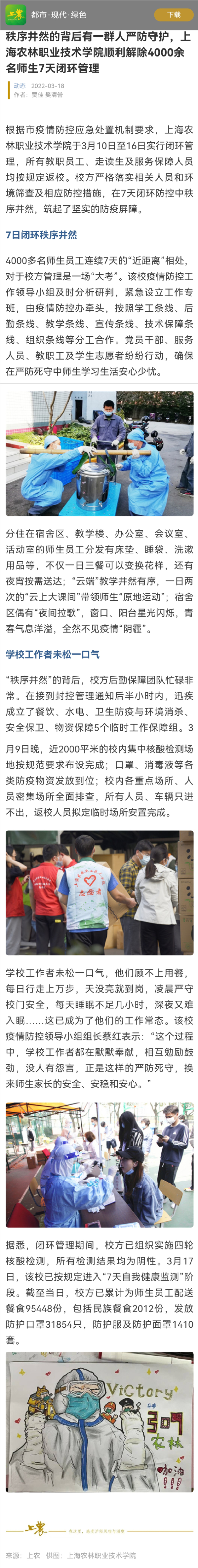 根据市疫情防控应急处置机制要求,上海农林职业技术学院于3月10日至16日实行闭环管理,所有教职员工、走读生及服务保障人员均按规定返校。校方严格落实相关人员和环境筛查及相应防控措施,在7天闭环防控中秩序井然,筑起了坚实的防疫屏障。