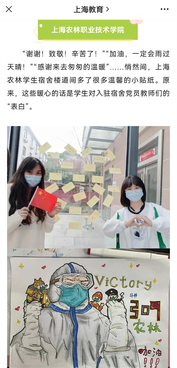 “谢谢!致敬!辛苦了!”“加油,一定会雨过天晴!”“感谢来去匆匆的温暖”……悄然间,上海农林学生宿舍楼道间多了很多温馨的小贴纸。原来,这些暖心的话是学生对入驻宿舍党员教师们的“表白”。