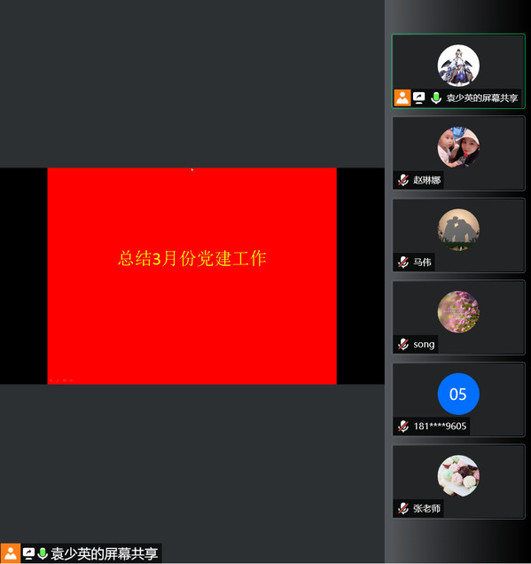 首先,会议总结了3月份党建工作。3月份党建工作完成了党费更新与统计、“初心讲堂”专题学习,持续打卡“学习强国”,发展党员、组织关系转接、信息报送、主题党日、结对共建、闭环管理期间志愿者活动等工作事项,党建工作扎实推进。期间,学校遭遇了一场防疫战,从闭环管理到准封闭管理,党员代表们都积极加入防疫一线,及时对困难结对学生给予心理情绪安抚与生活帮助,与广大师生守望相助,同心协力筑牢校园防疫屏障,并以此得到充分肯定和鼓励。