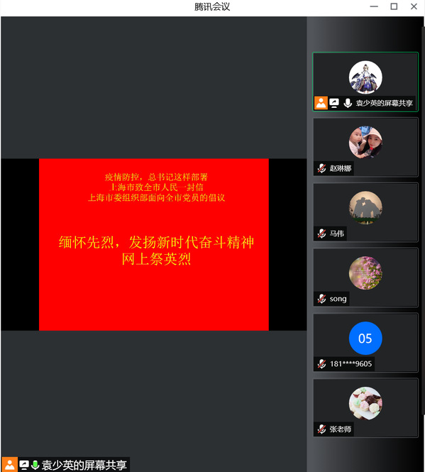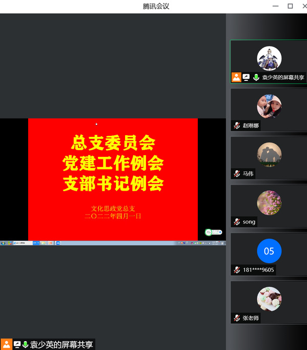 为进一步落实好疫情防控期间党务工作,4月1日上午,文化思政党总支线上开展总支工作例会,同时开展“网上祭英烈”活动,各党支部书记、总支委员、组织员参加会议。党总支副书记袁少英主持活动。